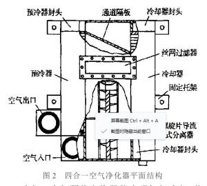 广东华纯公司新设计的具有相似功能和结构的新型、高效、空气-空气预热交换器能实现初级冷却,节省能量。四合一空气净化器将空气-空气预热交换器和空气-制冷剂热交换器的效能综合于一体,简化了管系,使整机尺寸大为减小,成本降低。热交换器是空气净化器的重要组成部分,足以影响其机组的尺寸与经济性。因此,预冷器和冷却器都采用紧凑、高效的铝制板翅式热交换器。板翅式换热器由芯体、封头、接管和支座组成。热交换由芯体完成,因此最关键的部件是芯体。芯体的基本结构为通道,由翅片(导流片)、隔板、封条组成。单通道是在金属平板(称为隔板)上放一翅片,然后再在其上放一金属平板,两边以封条密封。多个通道进行迭合,并钎焊成整体,就可得到板翅式换热器芯体。